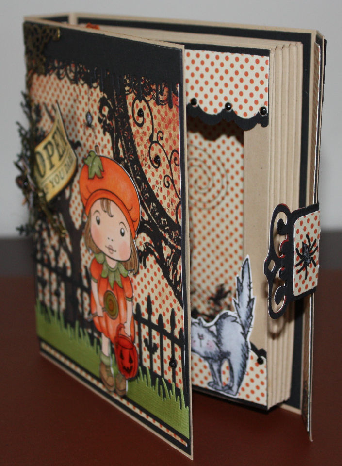 I call this a Halloween Treat Box. It can be filled with candies or crafting items for that special person. At one of Irina Blount's Workshops we made a similar box. Box Recipe: Enchanted" Two-Sided Paper, La-La Land Marci Stamps colored with Copic Markers, Brave Kitty stamp by Whipper Snapper, Sentiment by A Muse, Cuttlebug Dies, Bling, Punches, Diamond Glaze, Tag by Whimsy, and Metal Embellishments. On the closure, I used a magnet (which is concealed under the DP).